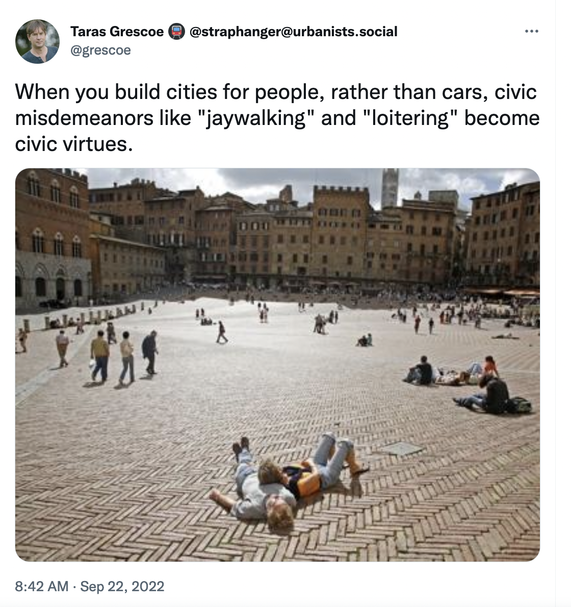 That city was built 600 years ago, no shit it wasn't built for cars.Also most european third spaces are being inundated with migrant and gypsy trash and just as unattractive as your local gas station to hang out at.Truth is, america is built for the FUTURE which entails being as far removed and insulated from the general public as possible because multiculturalism will continue to make public life worse and worse with no signs of slowing down.
