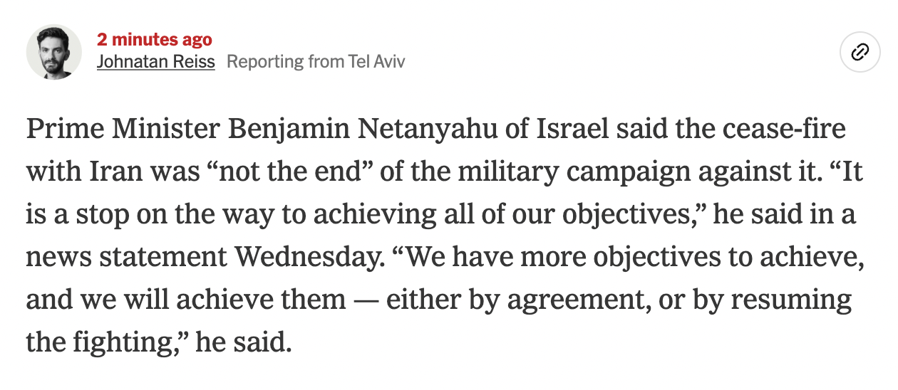 "Prime Minister Benjamin Netanyahu of Israel said the cease-fire with Iran was “not the end” of the military campaign against it. “It is a stop on the way to achieving all of our objectives,” he said in a news statement Wednesday. “We have more objectives to achieve, and we will achieve them — either by agreement, or by resuming the fighting,” he said." -- NYT