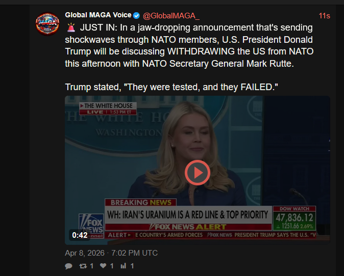 Trump announces withdrawl from NATO today and plans to focus more on Israelhttps://xcancel.com/GlobalMAGA_/status/2041954866852163959#m