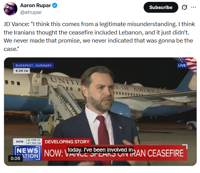 America is now rejecting the ceasefire because it says Israel has to stop bombing Lebanon, even though every other country including Pakistan have recognized that the ceasefire did in fact include a stipulation for Israel to stop bombing Lebanon.