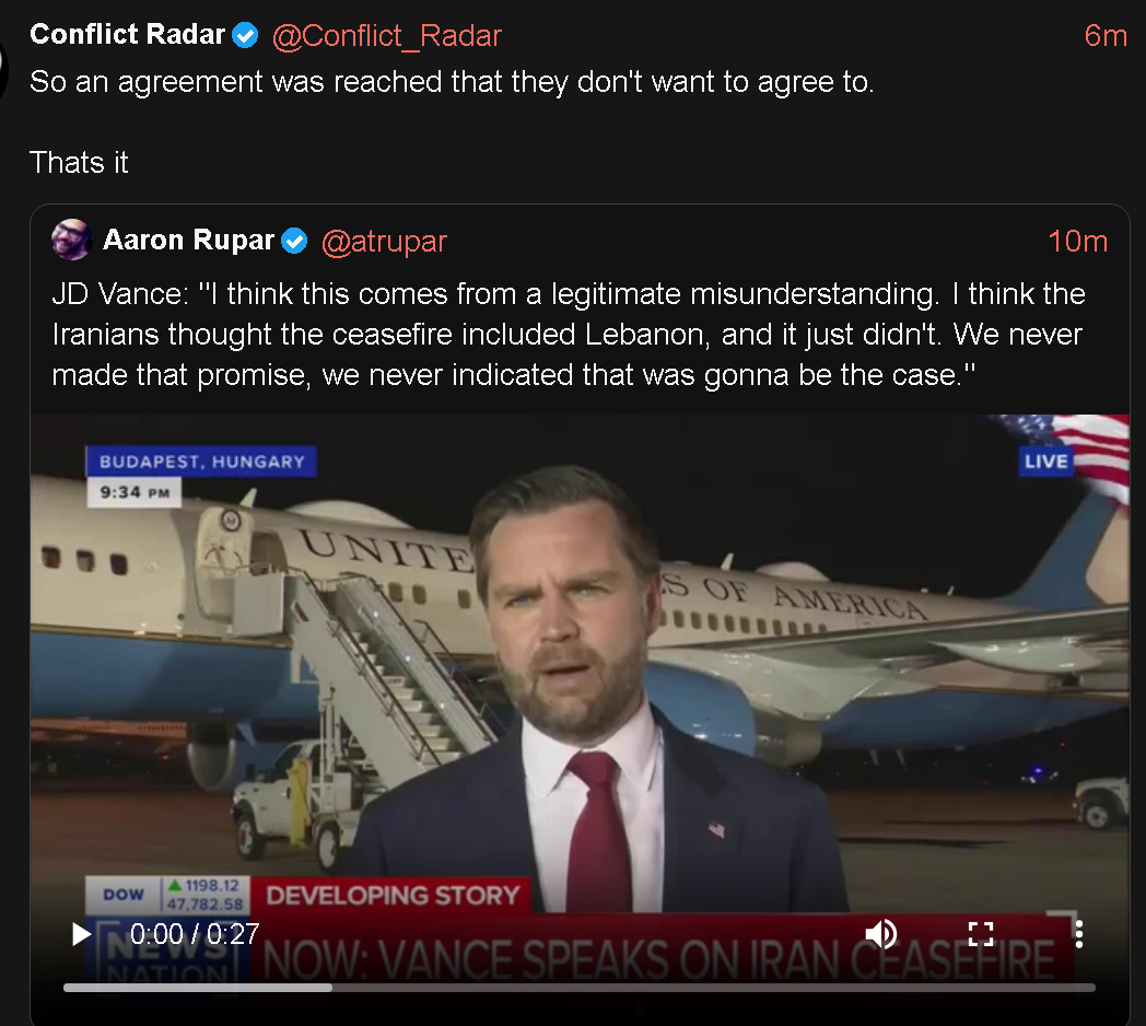 >>532747718>>Pakistan thought it included Lebanon>>Iran thought it included Lebanon>Jews told Trump they will continue attacking Lebanon>JD Vance: It was just a misunderstanding.Missing something there