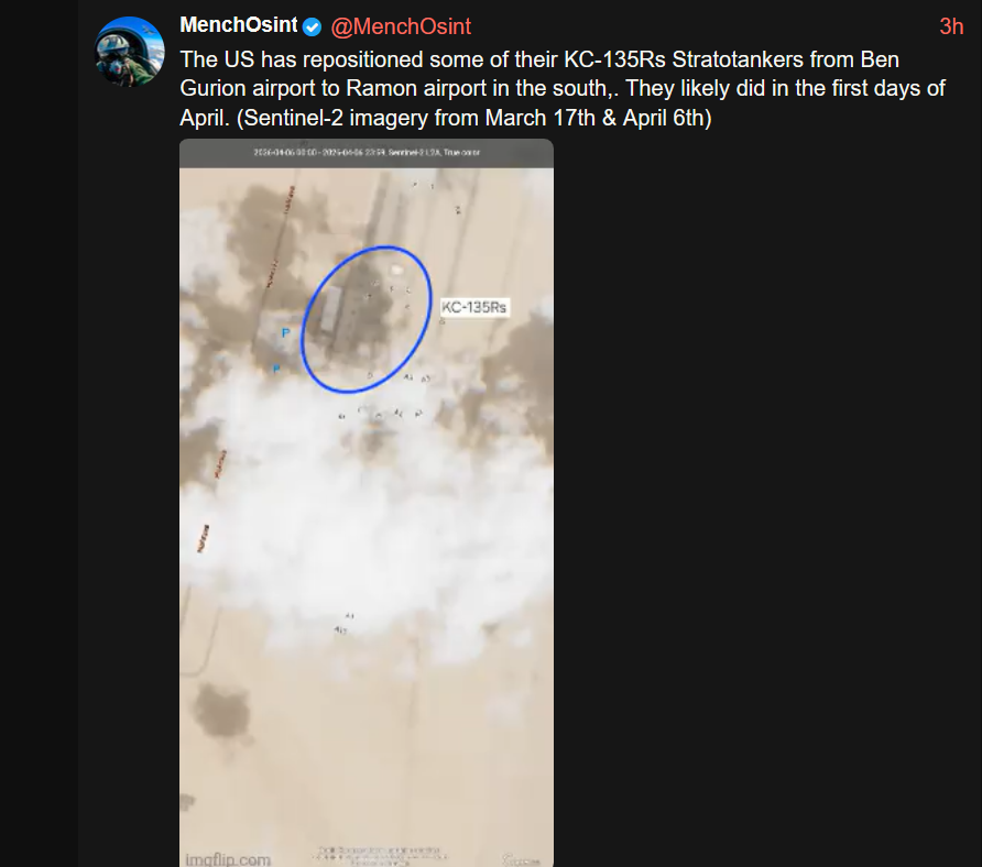 The US has rebased the stratotankers in israel to ramon airport in the southhttps://xcancel.com/MenchOsint/status/2041917102643089781#m