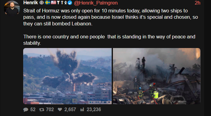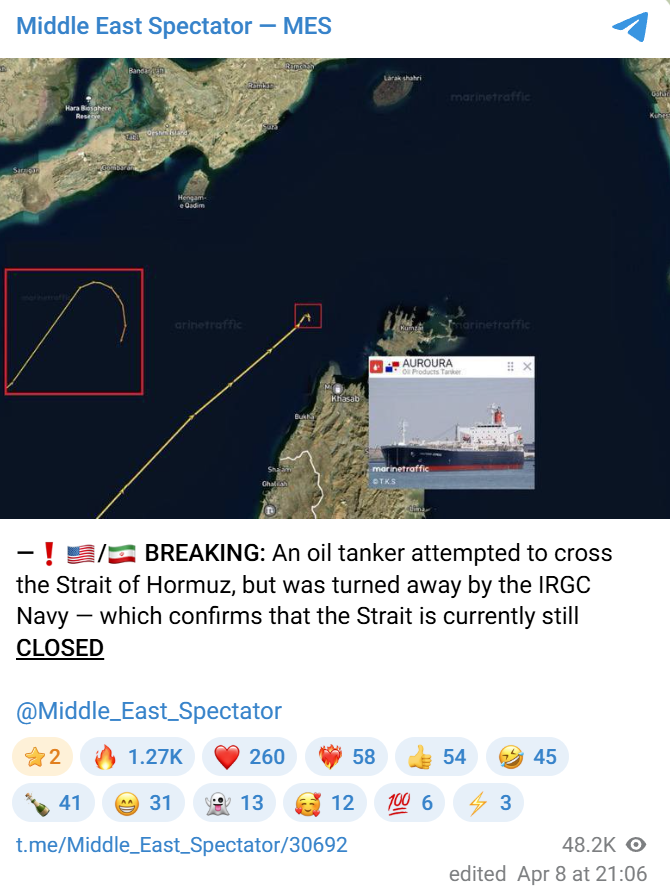 We’ve already seen an increase in traffic today; hopefully, we’ll see an increase in traffic tomorrow. We actually think that we are seeing signs that the straits are starting to reopen." - US Vice-President J.D. Vance in an interview, despite multiple signs showing the Strait of Hormuz isn't open.