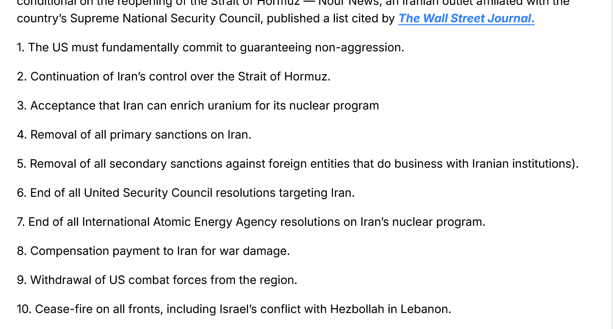 >>532749314>different 10 point plan submitted by Iranmay we see it? Iran has always been transparent about what it wants. Why is the United States keeping it secret? Do they think it's a joke?