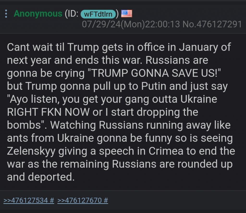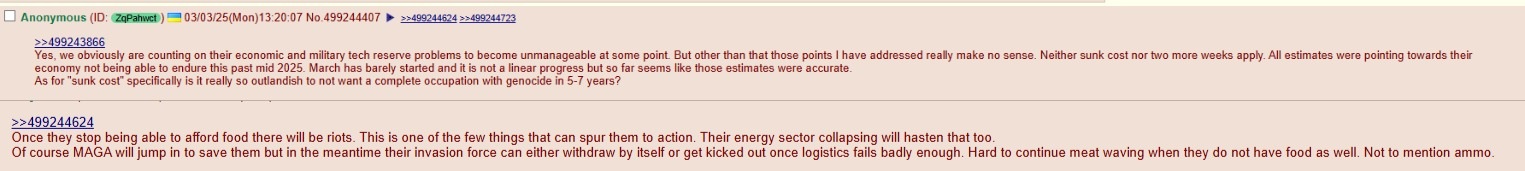 >>532752748>Are you talking about production of new weapons/equipment? Or logistics of getting said equipment to the front?Both. But logistics is a bigger problem than production.>Because Russia's infantry numbers have only grown since 2022 and Ukraine is still able to get enough men into trenches to make Russia's progress slow despite having to bussify.Yes, their contingent is growing, but it's not enough to turn the tide of the war. If they went all-in, like the Ukrainians, they could probably accelerate their advance, but they're very reluctant to forcibly mobilize people. They're avoiding it at all costs to avoid popular discontent. Russia is more sensitive to internal pressure than to external.>You are right about "element of surprise", but I'd think that a big enough force would be able to push through whatever drones the other side can muster to a specific location.I don't think so. If they do mobilize and manage to supply a contingent twice the size of Ukraine's, the result won't be much better. But it makes sense as a crushing blow after Ukraine's resources are depleted.