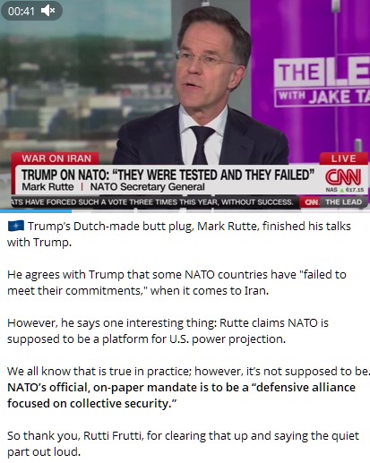 >He agrees with Trump that some NATO countries have "failed to meet their commitments," when it comes to Iran.>However, he says one interesting thing: Rutte claims NATO is supposed to be a platform for U.S. power projection.hahah rutti frutti spilling the beans for every normi out there.