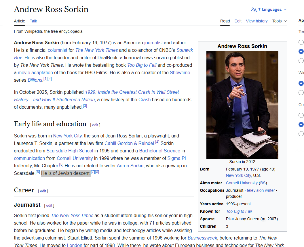 >>532753054Sorkin was born in New York City, the son of Joan Ross Sorkin, a playwright, and Laurence T. Sorkin, a partner at the law firm Cahill Gordon & Reindel.[4] Sorkin graduated from Scarsdale High School in 1995 and earned a Bachelor of Science in communication from Cornell University in 1999 where he was a member of Sigma Pi fraternity, Mu Chapter.[5] He is not related to writer Aaron Sorkin, who also grew up in Scarsdale.[6] He is of Jewish descent.[7][8]