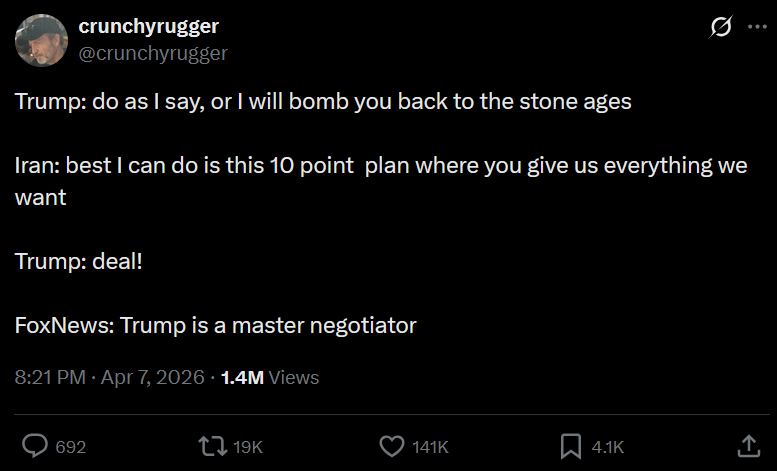 Shill bros...it's over. Trump won...not only did Iran cuck out but now we got low priced egg in our face...don't worry. It's organic.(I checked). Anyways, we lost...Trump has forced them to open the strait and accept a ceasefire from both sides. We owe Trump an apology and we should all quit... we keep losing no matter what...it's over....Trump was never TACO and he turned me into a...a.....Burrito Believer...