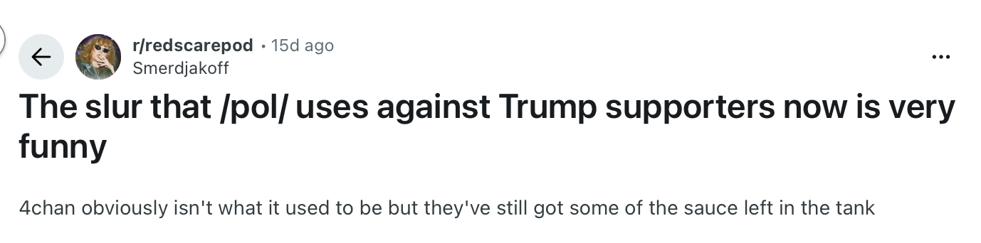 >>532764586TACO is actually a reddit meme, as in if you read about politics there everyone will be saying it. Idk why you'd even need to include it. The real issue is that they're raiding 4chan at all. How far has this place fallen to be raided by reddit of all places? 4chan used to be the website that did the raiding and it was so chaotic that no one would even bother raiding it, then people split off into discord and altchans when this website started to get more serious. Now when I see 4chan greentexts it's informative or polemic rather than absurdist. It's like everything reversed and reddit is now playing the part of reactionary trolls and 4chan is dedicated to hobby discussion.
