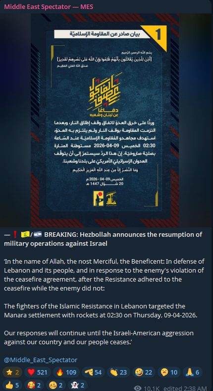 Previous: >>532764262Day: 1 of the 14-day ceasefire™ periodDay: 40 of the Special Military Operation™▶RECENT:>An oil tanker attempting to cross the Strait of Hormuz has just been turned around and is heading back to the Persian Gulf.>Iran closes the Strait of Hormuz, which was partially open for around 10 minutes this morning, until further notice due to Israel’s attack on Lebanon – Fars>Iran is preparing a military response to the Israeli aggression carried out in Lebanon – Fars>Trump confidant Mark Levin is currently on air with a shaking voice crashing out over the ceasefire with Iran. https://files.catbox.moe/pu9fh1.mp4>Associated Press reports that Iran and Oman will charge tolls for all ships passing through the Strait of Hormuz as part of the two-week ceasefire plan.>Reports of direct impacts in Be'er Sheva and Tel Aviv, according to Israeli media.>The U.S. negotiation team will consist of Vice President JD Vance and the two previous envoys, Jared Kushner and Steve Witkoff.>Iran says the US has agreed to its 10 point peace plan, which includes total Iranian control over the Strait and US troops withdrawing from the Middle East.▶WARNING:>Do not trust any "happenings" without link/proof>Uкraine / Russia discussions belong in uнg or cнug▶KINO:https://files.catbox.moe/cbd7ug.mp4https://files.catbox.moe/2hwzcx.mp4https://files.catbox.moe/smmsfw.mp4https://files.catbox.moe/x0fbgv.mp4https://files.catbox.moe/20lpu8.mp4▶Live-streams:https://www.youtube.com/watch?v=4E-iFtUM2kk https://www.youtube.com/watch?v=TdcrT5OcS9chttps://www.youtube.com/watch?v=53G-Oy4r6M4▶Telegram channelshttps://rentry.org/tgnews▶Israel Rocket Alertshttps://www.tzevaadom.co.il/en/▶Air Traffichttps://www.flightradar24.com/https://flightaware.com/livehttps://globe.adsbexchange.com/▶Maritime Traffichttps://www.marinetraffic.com/https://www.vesselfinder.com/