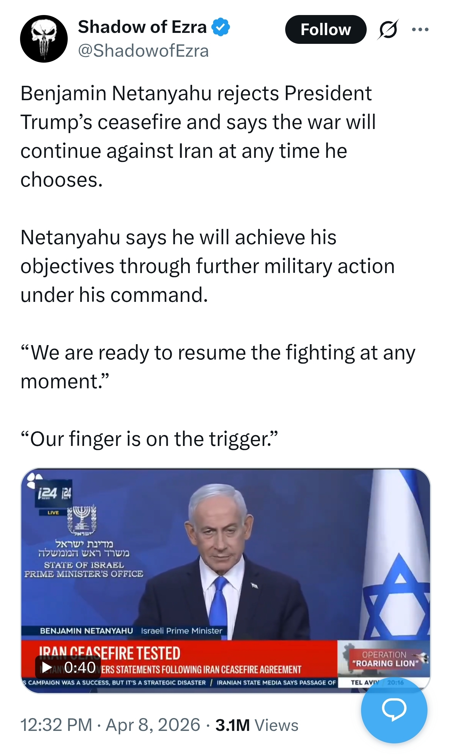 >Netanyahu launches terror attack on Beirut, destroying Trump’s ceasefire. We need to detach from Israel immediately.https://www.youtube.com/watch?v=w5aKtwQByXwhttps://x.com/TuckerCarlson/status/2042050749677375532>>532757520