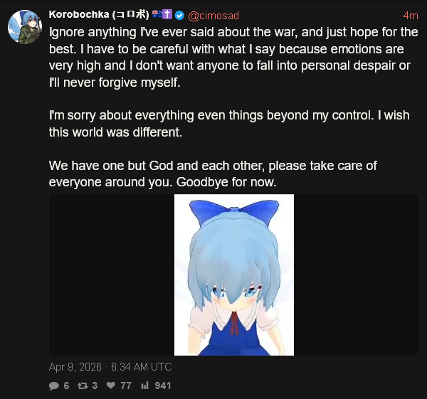 Previous: >>532771126Day: 1 of the 14-day ceasefire™ periodDay: 40 of the Special Military Operation™▶RECENT:>Hezbollah announces the resumption of military operations against Israel >Hungary privately offered assistance to Iran following a major Israeli operation targeting Hezbollah>Lebanon 316 confirmed dead in Israeli strikes; airports and bridges were stuck>An oil tanker attempting to cross the Strait of Hormuz has just been turned around and is heading back to the Persian Gulf.>Iran closes the Strait of Hormuz, which was partially open for around 10 minutes this morning, until further notice due to Israel’s attack on Lebanon – Fars>Iran is preparing a military response to the Israeli aggression carried out in Lebanon – Fars>Trump confidant Mark Levin is currently on air with a shaking voice crashing out over the ceasefire with Iran. https://files.catbox.moe/pu9fh1.mp4>Associated Press reports that Iran and Oman will charge tolls for all ships passing through the Strait of Hormuz as part of the two-week ceasefire plan.>Reports of direct impacts in Be'er Sheva and Tel Aviv, according to Israeli media.▶WARNING:>Do not trust any "happenings" without link/proof>Uкraine / Russia discussions belong in uнg or cнug▶KINO:https://files.catbox.moe/cbd7ug.mp4https://files.catbox.moe/2hwzcx.mp4https://files.catbox.moe/smmsfw.mp4https://files.catbox.moe/x0fbgv.mp4https://files.catbox.moe/20lpu8.mp4▶Live-streams:https://www.youtube.com/watch?v=4E-iFtUM2kk https://www.youtube.com/watch?v=TdcrT5OcS9chttps://www.youtube.com/watch?v=53G-Oy4r6M4▶Telegram channelshttps://rentry.org/tgnews▶Israel Rocket Alertshttps://www.tzevaadom.co.il/en/▶Air Traffichttps://www.flightradar24.com/https://flightaware.com/livehttps://globe.adsbexchange.com/▶Maritime Traffichttps://www.marinetraffic.com/https://www.vesselfinder.com/
