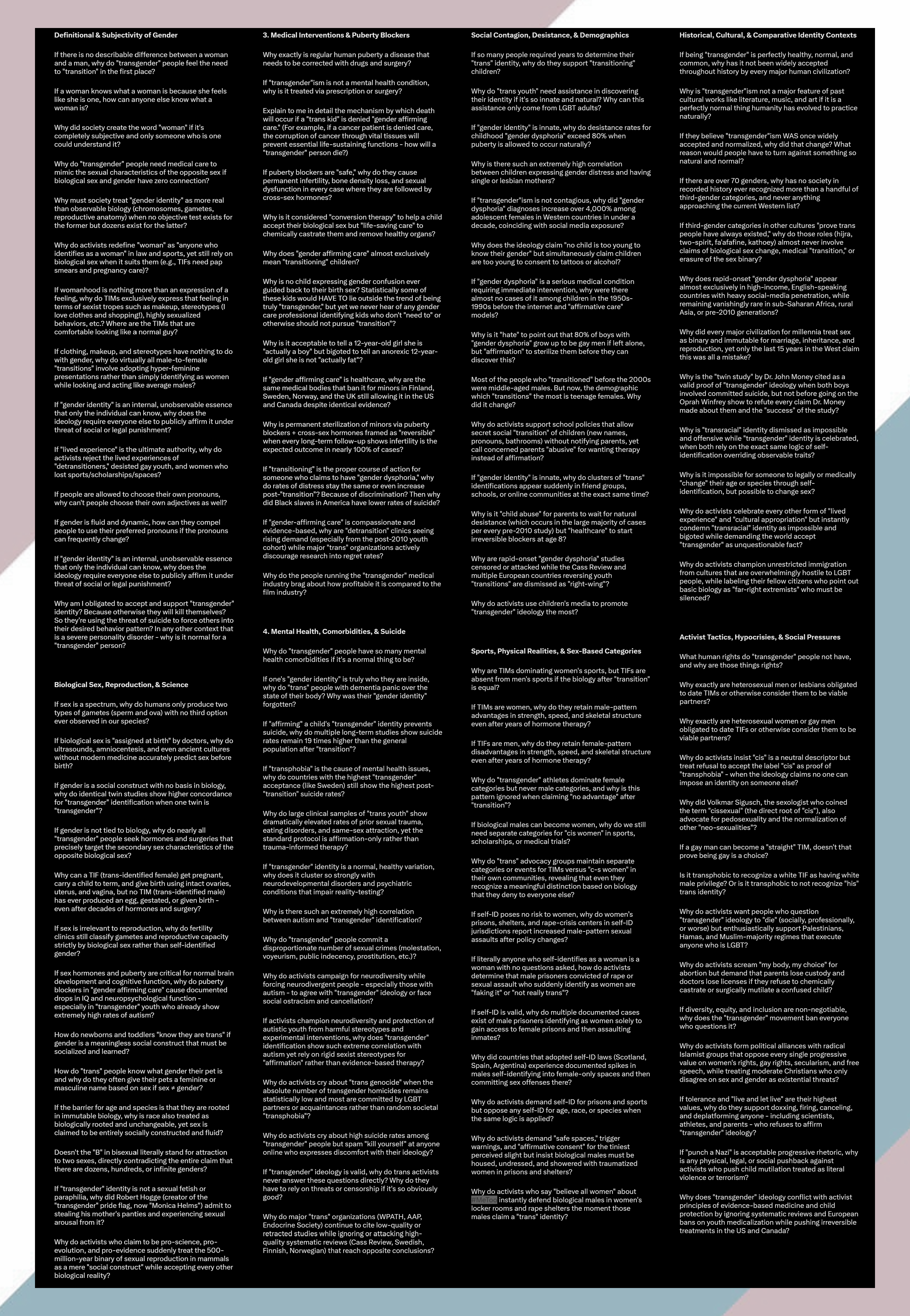 >>532779107Adjusted Odds Ratios revealed significantly higher odds of ever experiencing suicidal ideation in those who planned to transition.https://liebertpub.com/doi/10.1089/lgbt.2020.0231Gender-Affirming Surgery Leaves People Lonelier and Depressed, Study by Transgender Surgery Department Chairman Finds. https://dailysignal.com/2023/06/02/transgender-surgery-leaves-people-lonelier-depressed-study-by-transgender-surgery-department-chairman-finds/The FDA added a warning that gender-affirming drugs can cause dangerous brain swelling treatment may also interfere with rational decision-making. https://thepostmillennial.com/maker-of-puberty-blockers-funded-the-dutch-study-that-kicked-off-gender-affirming-care-for-kidsA pharmaceutical company that marketed triptorelin as a puberty blocker funded the original Dutch study that led to gender-affirming care for minors. https://tandfonline.com/doi/full/10.1080/26895269.2022.2108353 https://genspect.org/the-dutch-model/Gender services for minors expanded rapidly in Australia despite limited evidence Queensland plus 485 percent 2017-2022 Victoria plus 273 percent 2019-2023. The gender-affirming model requires clinicians not to question unstable gender identity even with severe mental illness. https://journals.sagepub.com/doi/10.1177/10398562241289488The European Society of Child and Adolescent Psychiatry states providers must not promote experimental transition treatments with unproven effects and must follow first do no harm. Puberty blocking harms psychosocial development due to unstable gender dysphoria diagnosis in children. https://link.springer.com/article/10.1007/s00787-023-02303-0Gender medicine for children rests on shaky foundations. https://bmj.com/content/385/bmj.p1662