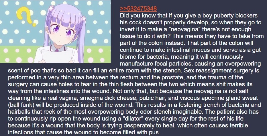 >>532780703remember jazz jennings, the first person they tried to normalize child transitioning with who had a tlc show?they gave jazz SRS before they had puberty and there wasn't enough tissue for jazz to have penetrative sex.then jazz got fat and suicidal and they canceled the show and memoryholed the whole thing. >>5327807665 seconds on google scholar anon. just type transgender and dementia and click search. its a very real phenomena. >>532780771not fully true. it depends how long they're on puberty blockers and how many years it takes them to be put on a dominant sex hormone. its fucking terrible for the human body to not have one, every trans person should know this kinda scary they'd let you take hrt and not tell you that.