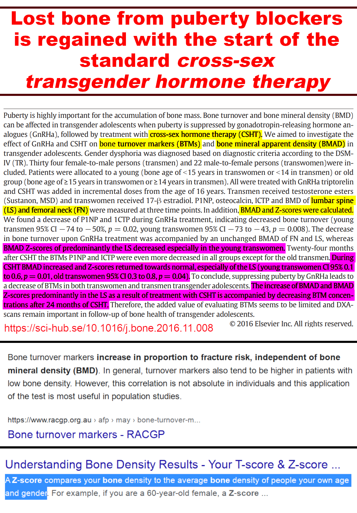 >>532779147Pediatrician debunks the myth that puberty blockers are reversible. https://archive.ph/9KHXYLupron used for chemical castration of sex offenders is also used as a puberty blocker. https://archive.ph/x8Q0XA 2003 New England Journal of Medicine study found Lupron caused osteopenia and excessive bone loss in some children with lifetime fracture risk outweighing benefits. https://archive.ph/H0JfdTriptorelin used to castrate sex offenders is also used as a puberty blocker. https://tandfonline.com/doi/abs/10.1080/0092623X.2010.498375Puberty blockers are irreversible due to negative impacts on bone density and child growth. https://binary.org.au/new_studies_prove_puberty_blockers_are_not_reversible/Puberty blockers do not alleviate negative thoughts in gender-dysphoric children and instead reduce height and bone strength. https://bmj.com/content/372/bmj.n486Puberty blockers significantly decrease bone density. https://pubmed.ncbi.nlm.nih.gov/32832823/Puberty blockers negatively impact bone mineral density especially at the lumbar spine. https://pubmed.ncbi.nlm.nih.gov/34497118/Puberty blockers have a negative impact on bone mineral density especially at the lumbar spine. https://pubmed.ncbi.nlm.nih.gov/36048500/Pubertal suppression decreases growth and height velocity. https://pubmed.ncbi.nlm.nih.gov/34315674/Leuprorelin, a puberty blocker, very negatively affects cognitive ability in developing children’s brains. https://pubmed.ncbi.nlm.nih.gov/12175403/Long-term observation of post-sex-change patients, expectations unfulfilled with somatic sexual social and severe psychologic complications including regret and suicidal thoughts. Surgery is counterproductive.https://tandfonline.com/doi/abs/10.3109/08039488.2011.628952May 2023 study social transition of children has no significant positive effect on mental health.https://archive.ph/ajE3k