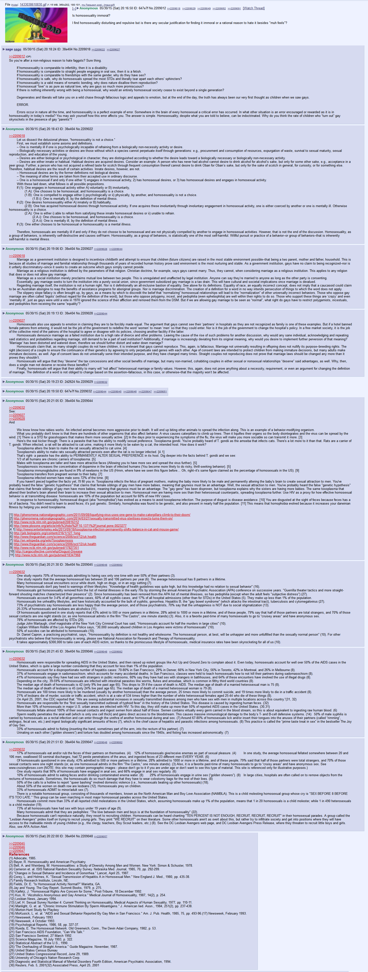 >>532778074>Social media didn't exist.Basically the gays got to choose how they were represented to the public. They got to make their push for rights about equality and love. If you were outside the heavily populated gay areas you had no way of knowing how degenerate they were, the rate of disease and rate of pedos within them.