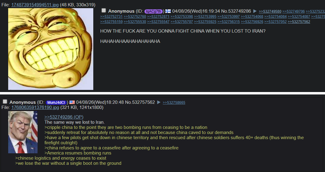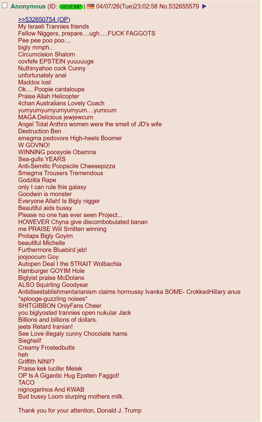 >>532783047>if you nearly get destroyed, you winChina called Iran and told them to stop being niggers when the bombers were on the way to BraPP Day.
