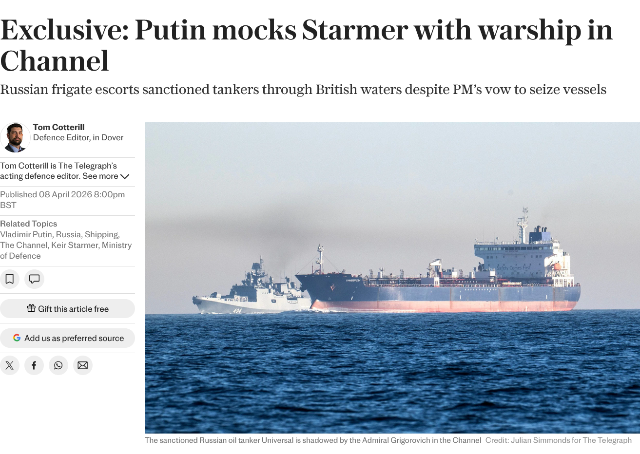 This is perfectly legal for Russia to do so; it's international waters and so anyone is entitled to passage through those waters.For Keir Starmer to come out with his stupidity that he's going to seize vessels in International waters? Yeah right. What a pathetic paper man he is.As for that warship, that is a Steregushchy class warship. That is about as elite as you can get right now! Light and maneuvreable with a pretty deadly payload. They have 12/16 VLS cells for Tsirkon missiles which could easily sink any other class the British navy has to offer. Oh wait, the British navy ain't got shit! We spent all our navy budget on shitskins from jeetland! Who would have thought an island surrounded by water might have a need for some sort of defence on the waters... the mind truly boggles!It does sort of speak to the mind that if they're casually throwing that sort of class as a fuck you to Starmer, it's rather obvious how they are keeping up with the war in Ukraine despite all the billions in International aid that Ukraine has taken. This is evidence that Russia is not as weak as most might think!