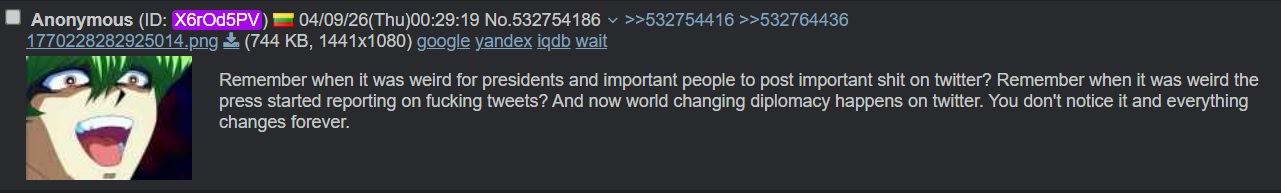 >>532789968>political implicationsworld is gay and retarded internet is more gay and retarded than world world become more like internet world is now even more gay and retarded