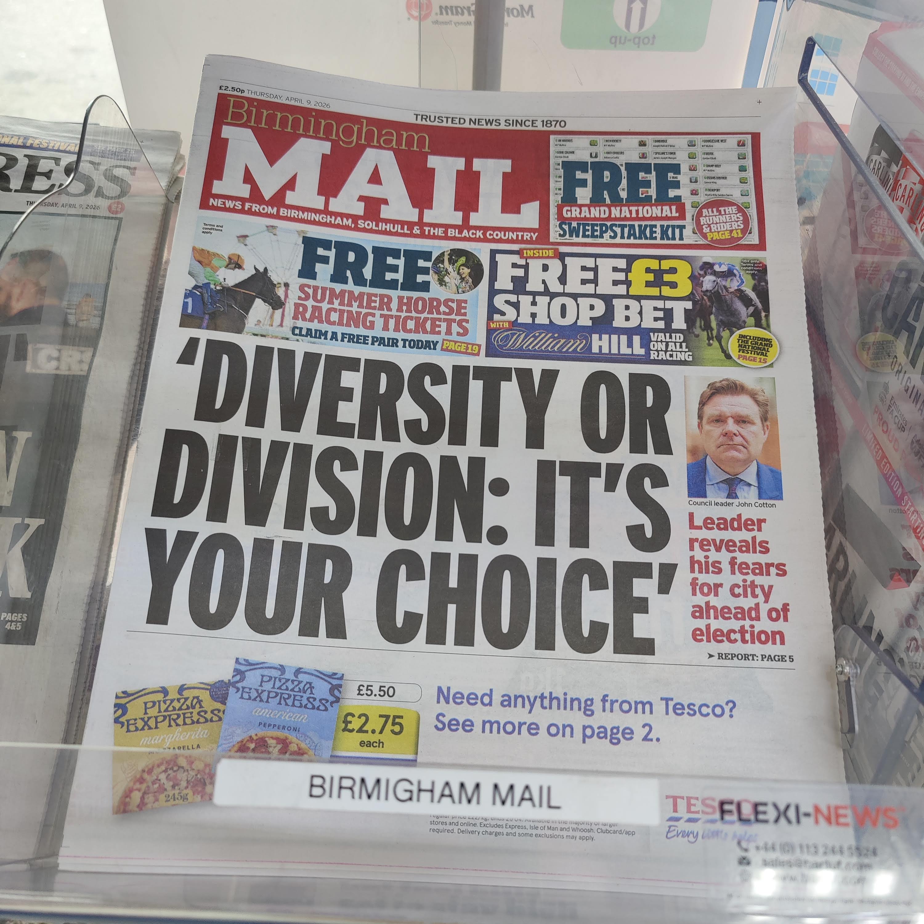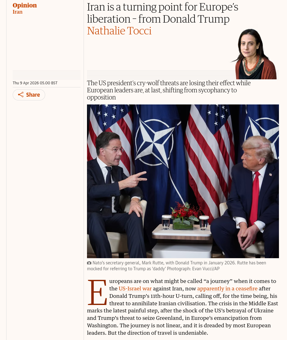 >Farmers warn of higher food costs due to Iran warhttps://www.bbc.co.uk/news/articles/c0q98w57k25o>Kemi Badenoch brands Keir Starmer 'all mouth and no trousers' on defence as he jets to the Gulf despite failing to produce vital plan for Britain's militaryhttps://www.dailymail.co.uk/news/article-15716651/Kemi-Badenoch-brands-Keir-Starmer-mouth-no-trousers-defence-jets-Gulf-despite-failing-produce-vital-plan-Britains-military.html>Russia threatens UK with 'nuclear or non-nuclear' strikes - 'We'll blow it up!'Fuckin' 'mon thenhttps://www.express.co.uk/news/world/2191923/russia-threatens-uk-propaganda-shadow-fleet>Relish your last pot of Gentleman’s Relish – it’s officially toasthttps://archive.ph/Rcmfr>‘Excessive’ financial risks threaten survival of many English universities, report warnshttps://www.theguardian.com/education/2026/apr/09/english-universities-excessive-financial-risks-survival-warns-thinktank>British man charged with directing activities of Somali terror group Al-Shabaabhttps://www.independent.co.uk/news/uk/crime/jermaine-grant-terror-charge-alshabaab-somalia-b2954312.html>Musician’s heartbreak as son, 21, stabbed to death in fight at Primrose Hill beauty spot where ‘he had gone to film’https://www.standard.co.uk/news/crime/primrose-hill-stabbing-viewpoint-met-police-murder-b1277940.html>'Not generated by AI' RSPCA forced to confirm shocking photo of 250 dogs is realhttps://www.itv.com/news/anglia/2026-04-08/shocking-photo-of-250-dogs-in-one-property-is-not-ai-says-rspca