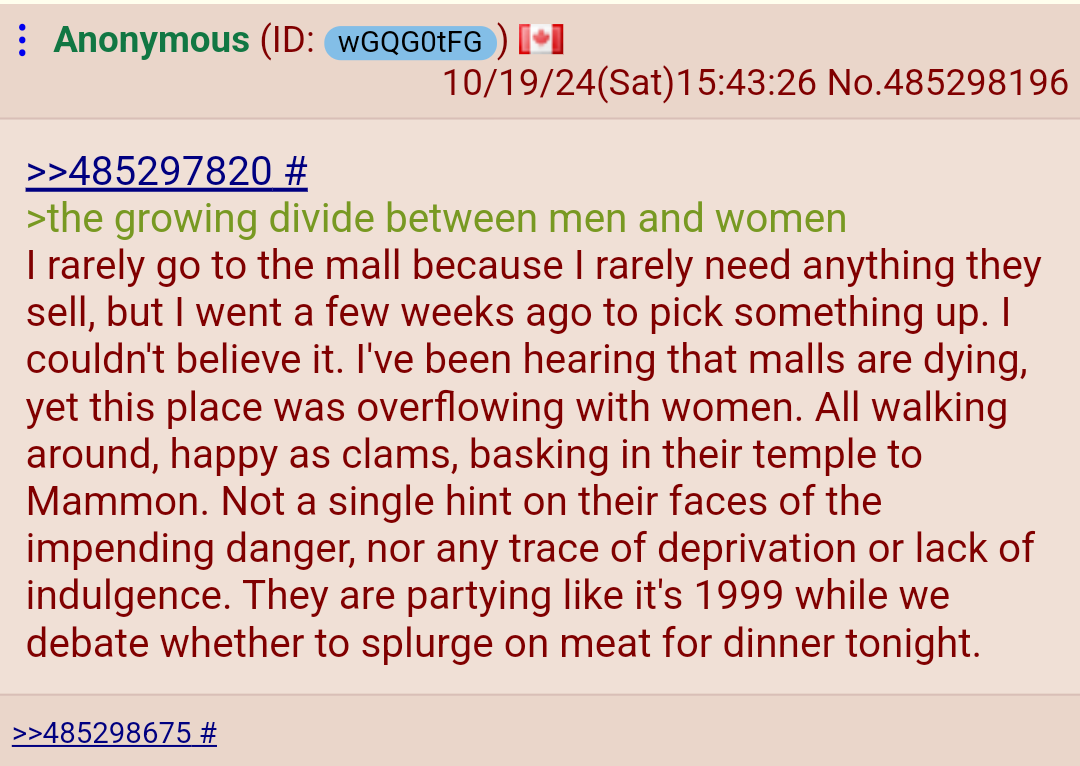 >>532791270I have a challenge for /pol/ tards. Whenever you read something like "women are much happier and healthier when..." replace "women" with "humans". If it works, you are reading something through a misogynistic lense.