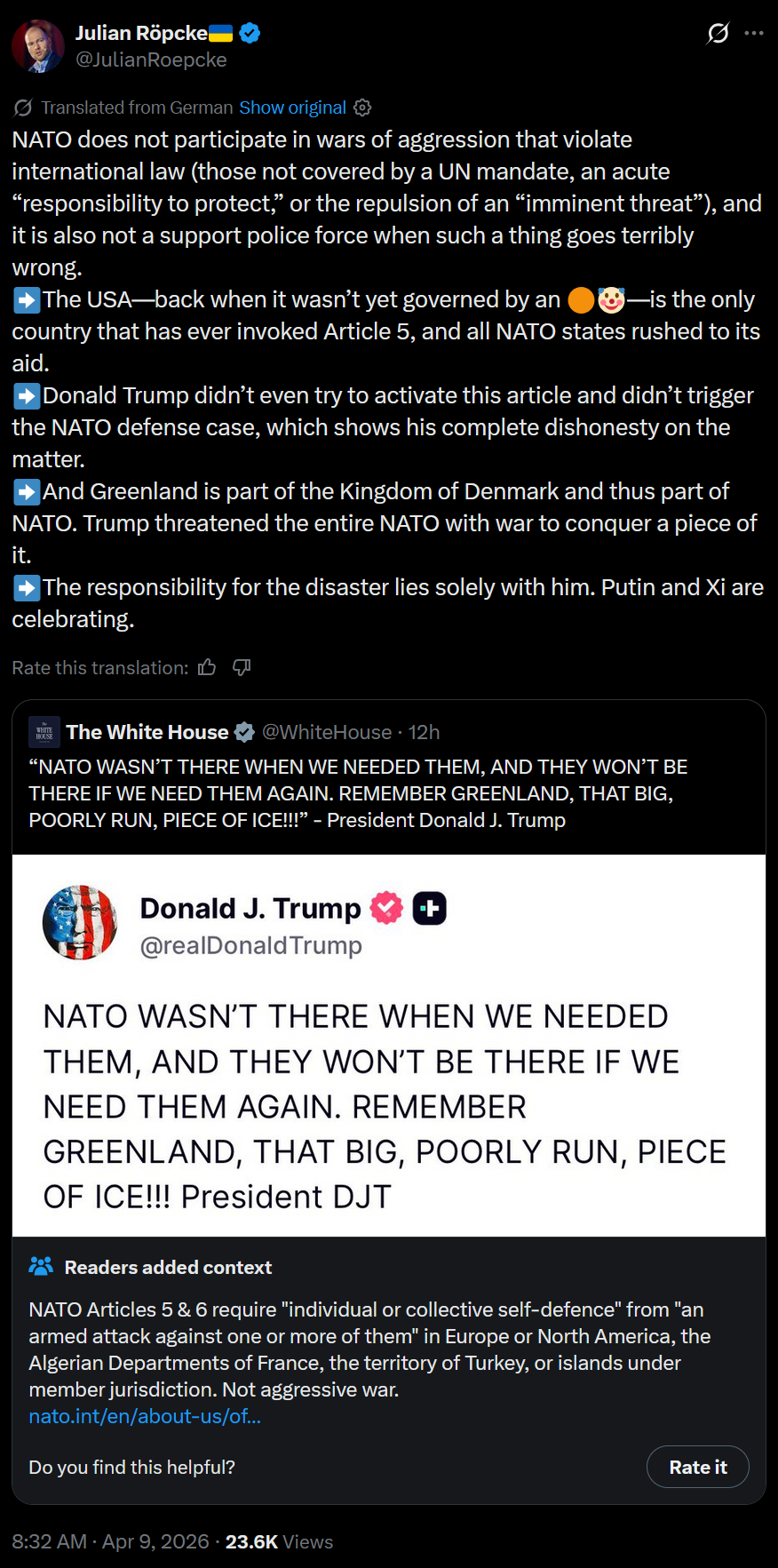 >Pakistan says the ceasefire also applies to Lebanon>France says the ceasefire also applies to Lebanon>Spain says the ceasefire also applies to Lebanon>UK says the ceasefire also applies to Lebanon>Australia says the ceasefire also applies to LebanonProbably not a good time for Trump to be making demands of NATO, he might pushe them over the edge from "not our problem" to "The US is now our problem".Soon enough, those nations will rejoice at the end of NATO.