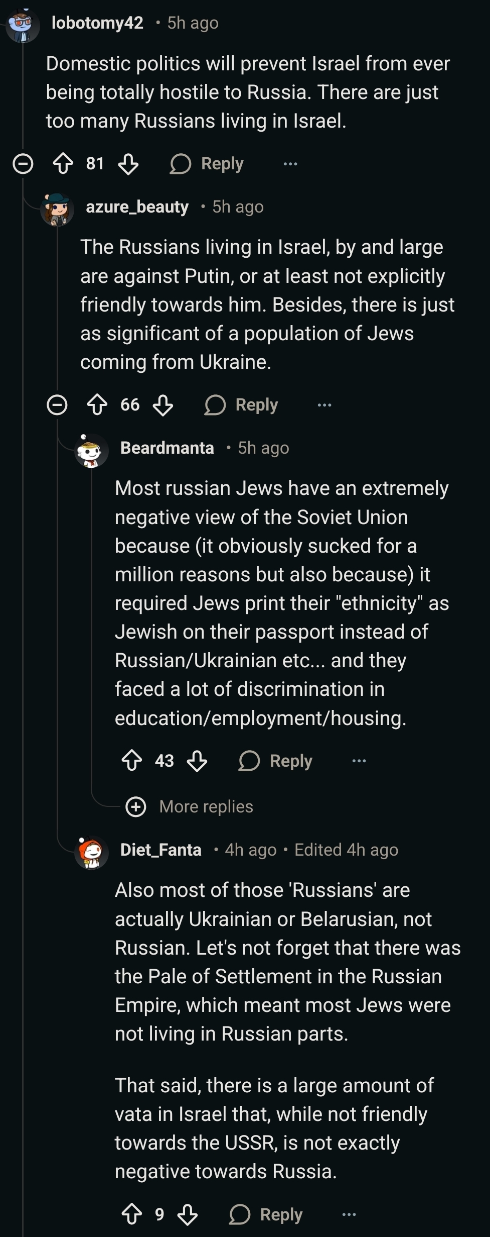 >>532798390To my knowledge, despite their politicians being mostly Ashkenazi, Likud's electorate is mostly Mizrahi, so the opinions of "Russian" (post-soviet ashkenazi) jews shouldn't have much influence on them.