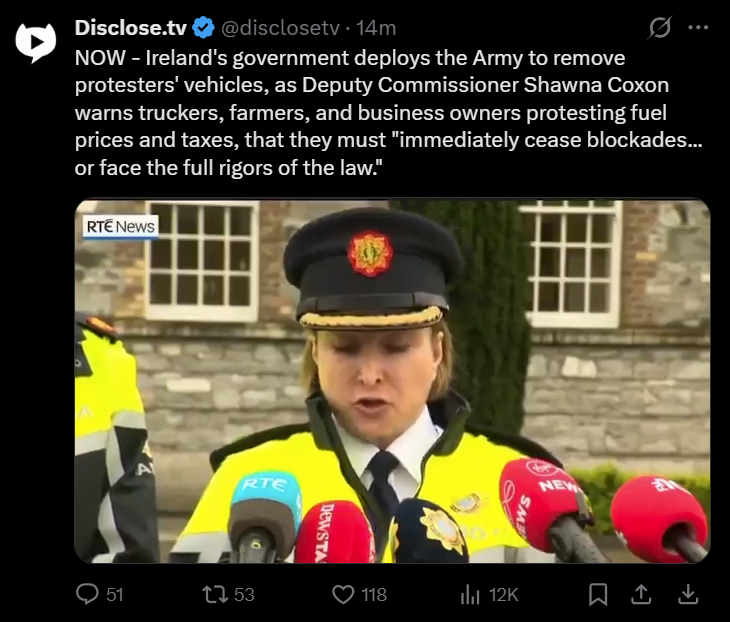 I really don't think they thought through the optics of sending fucking tanks to a protest in a country where many people have never seen a soldier in real life outside of parades lol, even if they're just sending them to haul tractors off the roads. They may have properly shit the bed on this one.