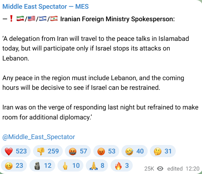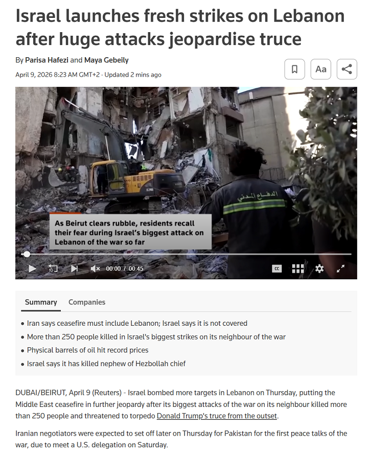 Previous: >>532791478Day: 2 of the 14-day ceasefire™ periodDay: 41 of the Special Military Operation™▶RECENT:>Brent crude is back to 100$. Northern Israel starts getting lit up with missile alerts>Netenyahu announces they will continue attacking Lebanon despite ceasefire. Hezbollah announces the resumption of military operations against Israel>Hungary privately offered assistance to Iran following a major Israeli operation targeting Hezbollah>Lebanon 316 confirmed dead in Israeli strikes; airports and bridges were stuck>An oil tanker attempting to cross the Strait of Hormuz has just been turned around and is heading back to the Persian Gulf.>Iran closes the Strait of Hormuz, which was partially open for around 10 minutes this morning, until further notice due to Israel’s attack on Lebanon – Fars>Iran is preparing a military response to the Israeli aggression carried out in Lebanon – Fars>Associated Press reports that Iran and Oman will charge tolls for all ships passing through the Strait of Hormuz as part of the two-week ceasefire plan.>Reports of direct impacts in Be'er Sheva and Tel Aviv, according to Israeli media.▶WARNING:>Do not trust any "happenings" without link/proof>Uкraine / Russia discussions belong in uнg or cнug▶OILhttps://oilprice.com/oil-price-charts/▶KINO:https://files.catbox.moe/cbd7ug.mp4https://files.catbox.moe/2hwzcx.mp4https://files.catbox.moe/smmsfw.mp4https://files.catbox.moe/x0fbgv.mp4https://files.catbox.moe/20lpu8.mp4▶Live-streams:https://www.youtube.com/watch?v=4E-iFtUM2kkhttps://www.youtube.com/watch?v=TdcrT5OcS9c https://www.youtube.com/watch?v=53G-Oy4r6M4 ▶Telegram channelshttps://rentry.org/tgnews▶Israel Rocket Alertshttps://www.tzevaadom.co.il/en/▶Air Traffichttps://www.flightradar24.com/https://flightaware.com/livehttps://globe.adsbexchange.com/▶Maritime Traffichttps://www.marinetraffic.com/https://www.vesselfinder.com/