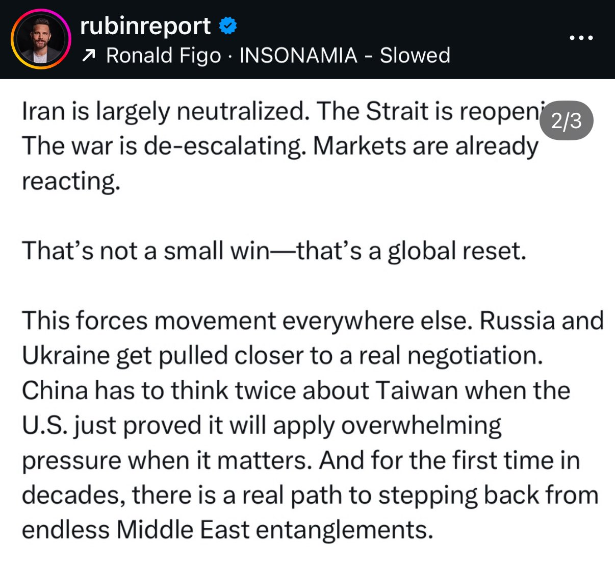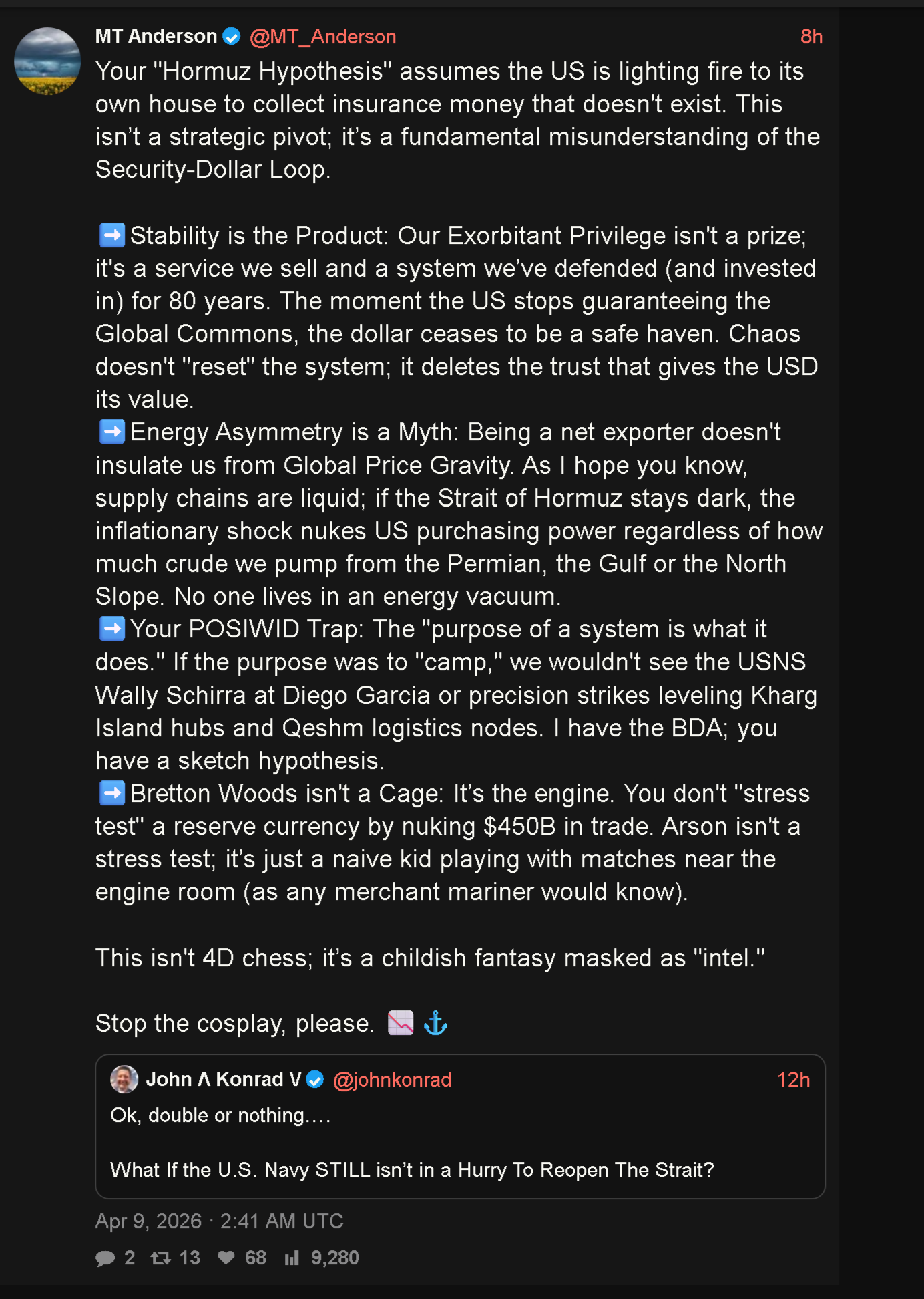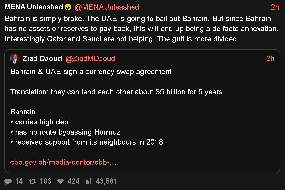 The economics are still a fun topic in this war.Oil and gas exports are expected to bring in ~$70bn this year to Iran, at full capacity and lower prices we might look at $80bn.Tolls from Hormuz, annualized, are expected to bring in ~$64bn.These are almost pure profit (90% on oil/gas, 100% on tolls).So almost 130bn of pure helicopter money to the state.If the state spends this money on infrastructure or making weapons, the GDP multiplies by 1.2-1.5 on the spent amount meaning we get about an annualized GDP surplus potential of $175bn.The pre war economy was about $450bn. Oil revenues have increased by ~25bn, tolls add a further 64bn and the regime spending can increase this with another 175bn.This gives a total potential increase of ~$265bn or a 60% increase in the size of the economy if the peace remains. (minus what is lost in the civilian services, consoomerism etc)While the real outcome will be lower GDP increase (since some industries are damaged etc and not all spending will go to boosting jew numbers), this does look very much like a big fat win to me.As a bonus, the gay UAE land claims on Siri and Abu Musa will defacto have been solved and the associated oil and gas fields are now Iranian.If one was to do a similar cost/benefit analysis on the US, thing will look different and it is even unclear if the US can afford to re-arm their navy.Oh, and all these Iranian revenues will be in crypto and yuan, so it is a double win for them and double L for the US.