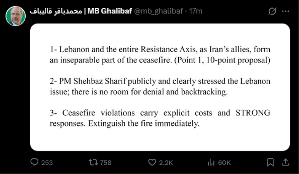 >>532796258Why are you people like this? The ceasefire is no one will attack each other and the strait is open for two weeks. That's it. You really need to stop getting your information from twitter bait