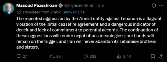 The interesting part of this is that Iran has unintentionally admitted it is an occupation force in Lebanon."Oh i assumed you knew that was mine!" Lovely stuff.Wonder how long until Trump's patience eears out, with any party.