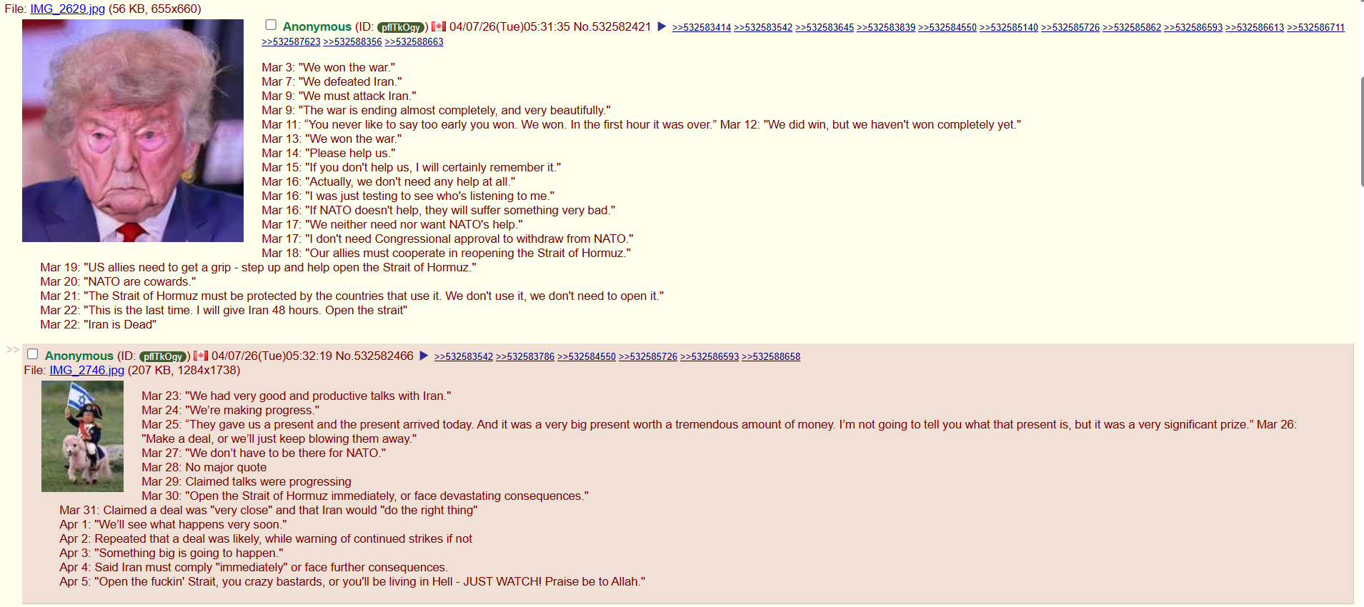 >>532817524>>532817754>BRICStards claim a totally total victoryAmerican objectives are all failed, their decapitation has done nothing, Iran is more United than ever, NATO is fracturing in real time, sanctions lifted on Iran and Russia, American attempts to infiltrate the country are repelled and Trump is having daily meltie on social media, utterly obliterating us hegemony.The only measurement by which Iran has lost is in total body count and in military assets.