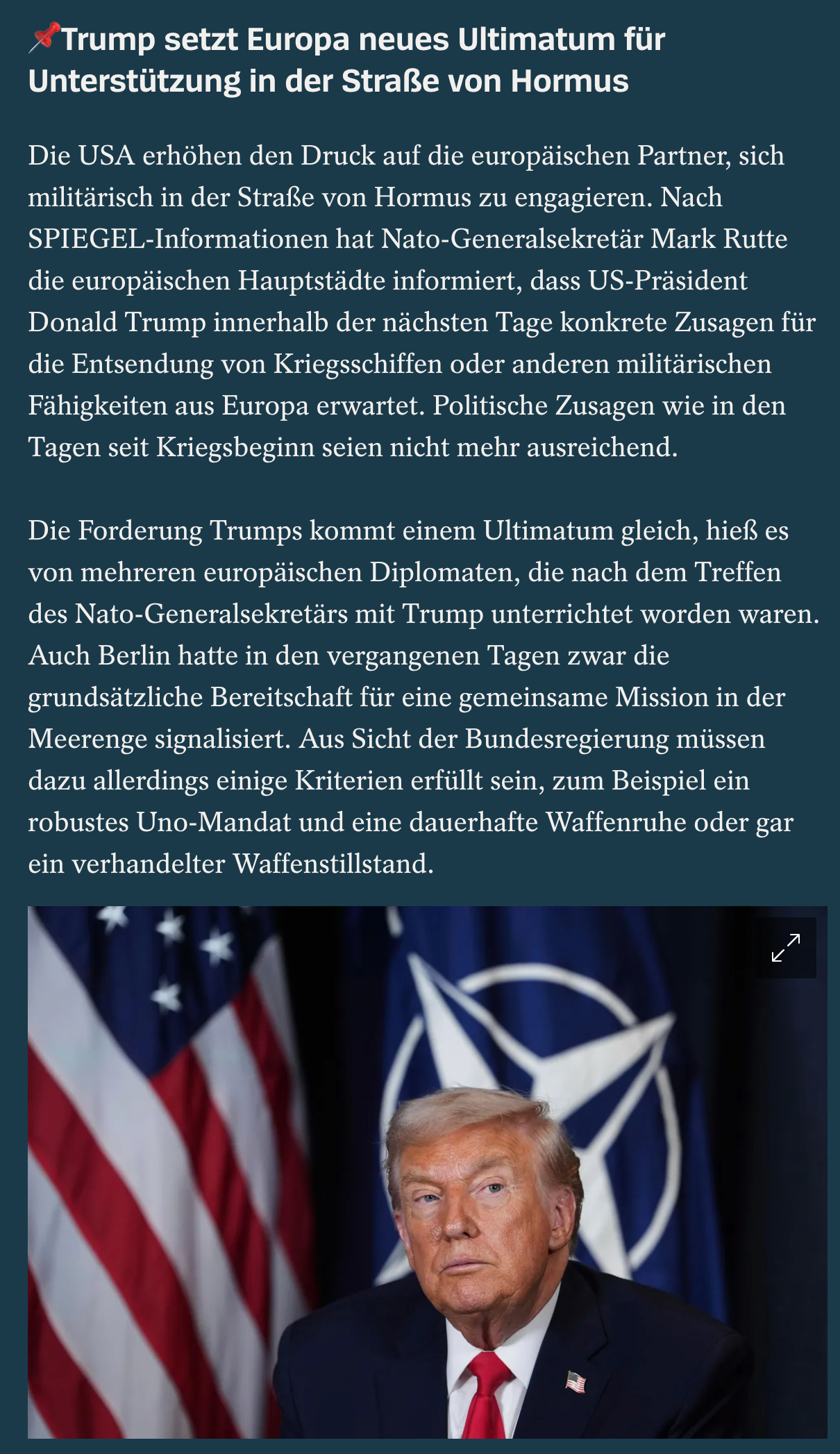 [Breaking] Trump issues new ultimatum to Europe for support in the Strait of Hormuz!!!According to a report by SPIEGEL, Germany's largest news outlet, it has been revealed that Trump demanded a definitive commitment from NATO nations today!!https://www.spiegel.de/ausland/iran-news-am-9-april-trump-erwaegt-offenbar-truppen-abzug-als-bestrafung-fuer-nato-staaten-a-a7d1f3c7-10f4-4b72-818d-b51ddb789faf?sara_ref=re-xx-cp-sh