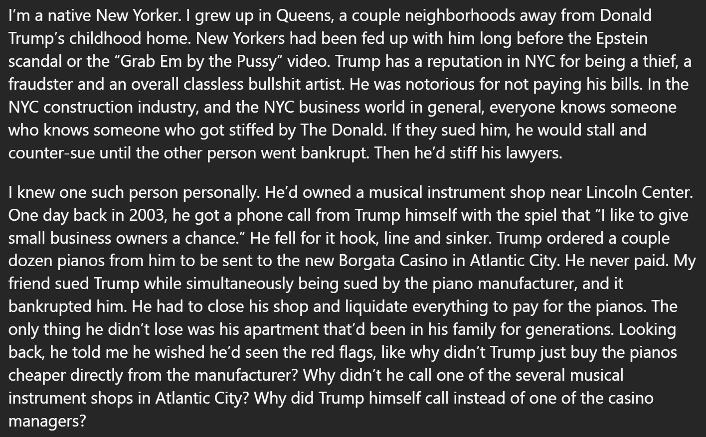 >>532801008>he has never actually negotiated a single thing in his entire lifeSounds about right. The detail that ties it all together to me is actually the goofy way he types -- with seemingly random capitalizations of nouns, almost baroque use of commas... all held in contrast against what is often totally inane in content. He writes like that because that's how his lawyers write. Obviously, he has spent more time gaming the system with his lawyers than "making deals" -- they're what he falls back on when his normal disingenuous pressure cons don't work. I've dealt with people like Trump before. I just wish more Americans had. If you ever found yourself sitting across the table from someone like Trump with something at stake, if you have a shred of personal integrity, you would rightfully hate him like he's Lucifer himself. It's just very fucking obvious that he's a man with precisely no values -- the kind of person who will do or say anything under the sun if he can get what he wants.
