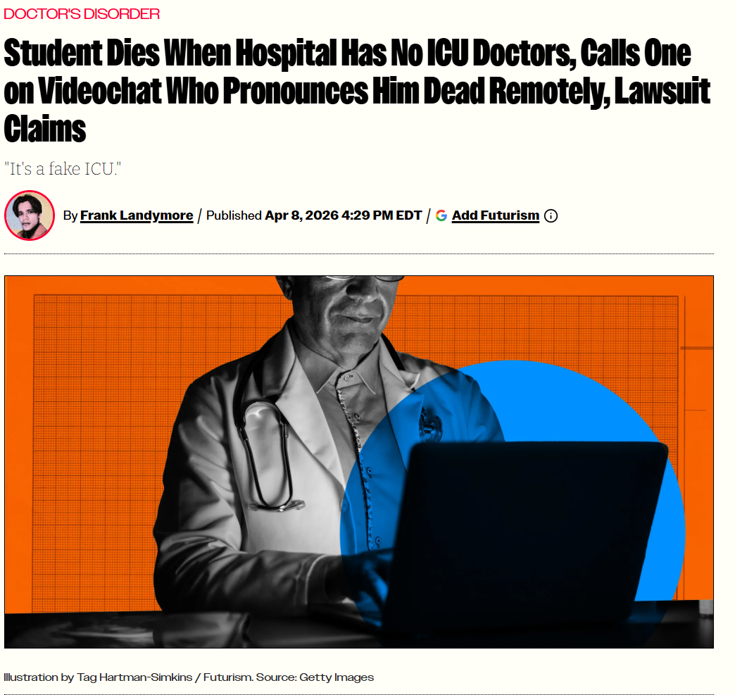 >A wrongful death lawsuit filed by the family of 26-year-old Conor Hylton alleges that he died in August 2024 at Bridgeport Hospital’s Milford Campus due to negligent care in a "telehealth-staffed" ICU. The lawsuit claims no doctor was physically present during the incident, leading to a critical 10-minute delay in resuscitation and a virtual death pronouncement via video screen.>The lawsuit says the hospital did not tell his family that Hylton’s condition had deteriorated and that he had been transferred to the ICU without a doctor on-site. Had the family known, Faxon said, they would have asked for a transfer to the Yale or Bridgeport hospitals, a short drive away.>By 4:30 a.m., the lawsuit says, Hylton had “slid down in bed, his eyes rolled back,” and he became unresponsive, with seizure-like activity. He received a tube to help him breathe, but he eventually went into cardiac arresthttps://archive.is/kG4Yr