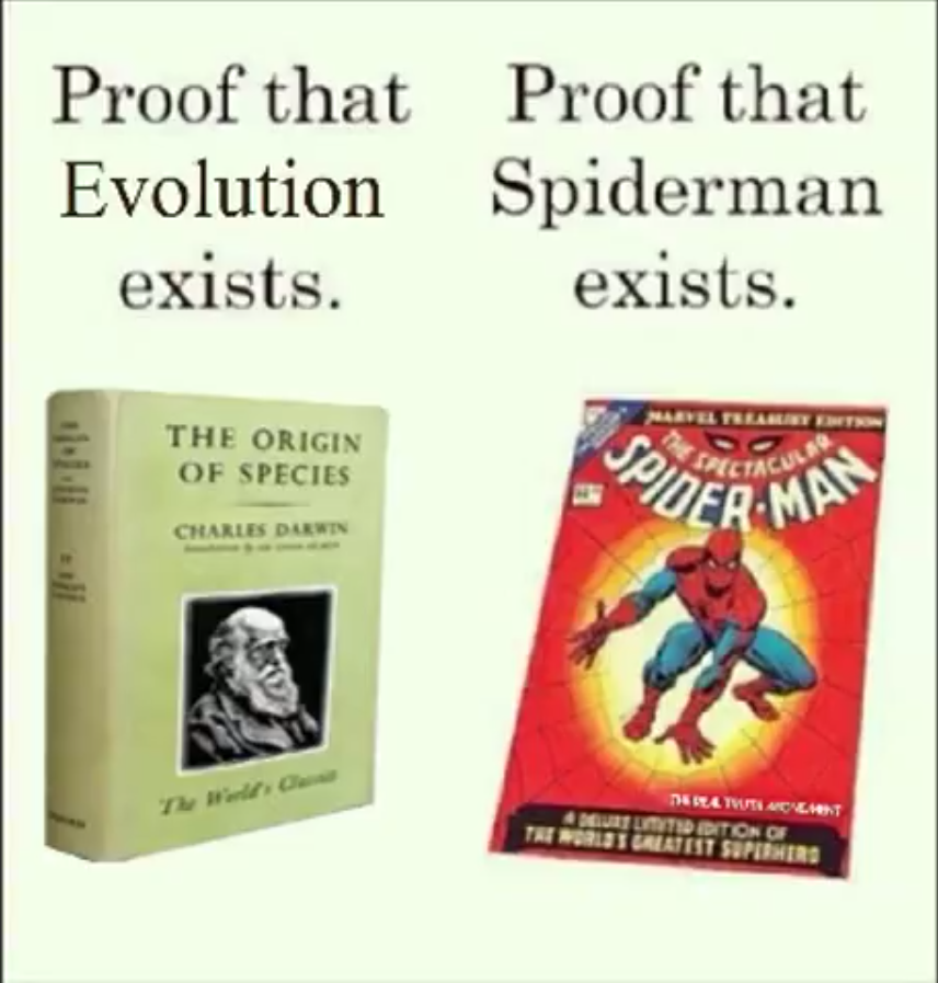 >>532807095The first book makes logical arguments why evolution is real, the second does not make logical arguments why Spiderman is real and is in fact and self-conscious form of fiction.