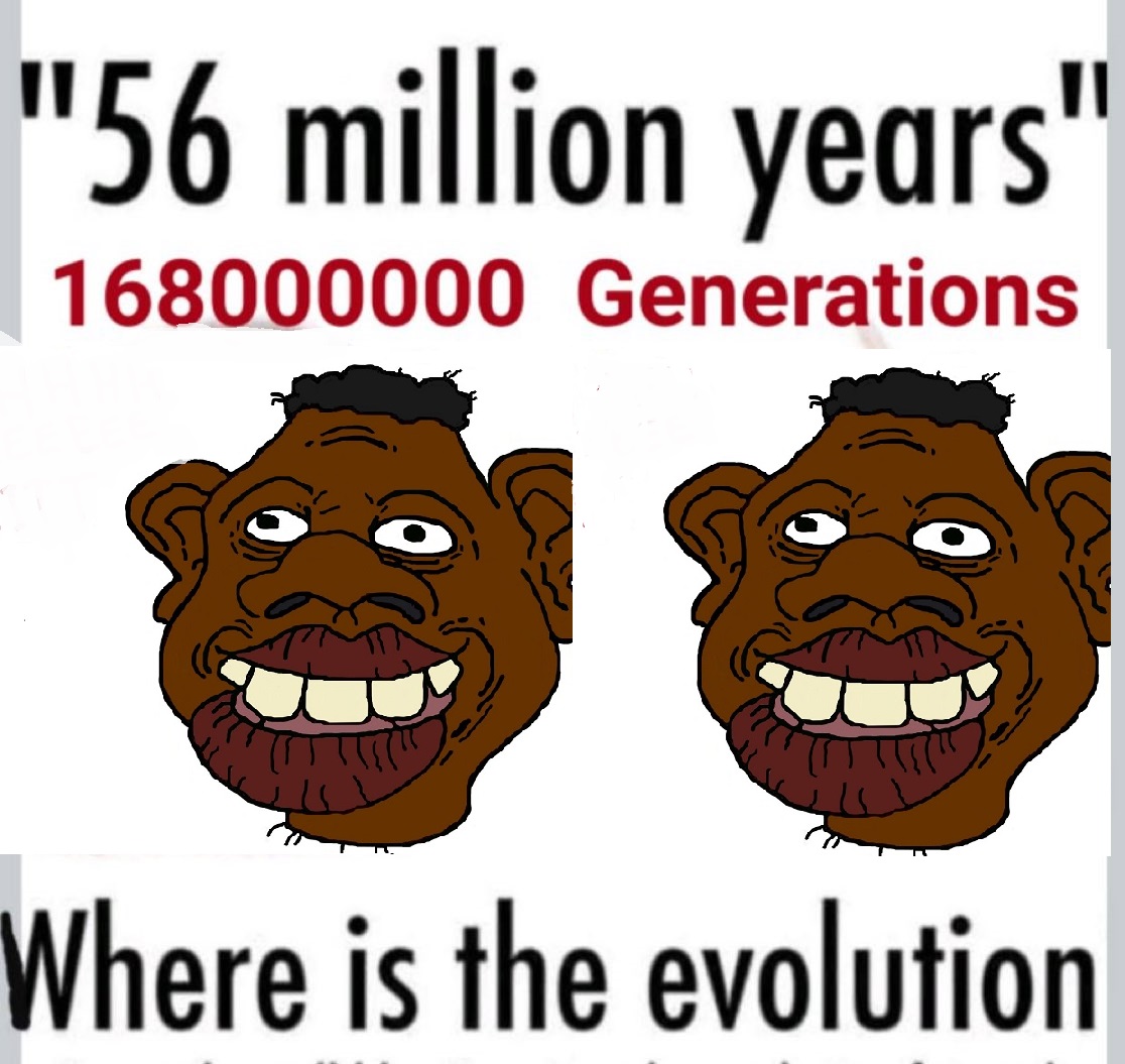 >>532806750>find random fossils of animals that no longer exists>wow these are very similar to current year animal, this must be evidence of evolution >no intermediary fossils ever found for any species>find 60 gorillion yo fossil that is identical to current year animals>wow they must have reached the peak of evolution in this particular niche>coexists with two dozen different species that do the exact same thing>God still not real>evolution still real despite all of evidence>muh evidence is 4 birds that grew different beaks after several generations because of environment >somehow this is not the case for niggers and they are 100% the same no exceptions with white euros