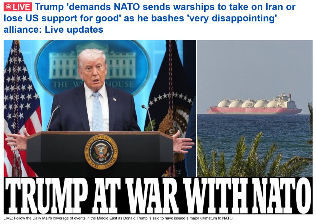 >>532811066why should NATO, a defense alliance, feel obligated to assist another country's war of aggression? Please explain that to me first. If Fat Orange simply hadn't bombed Iran, none of this wouldn't happen. But Americans are incapable of taking responsibility so it's always someone else's fault.