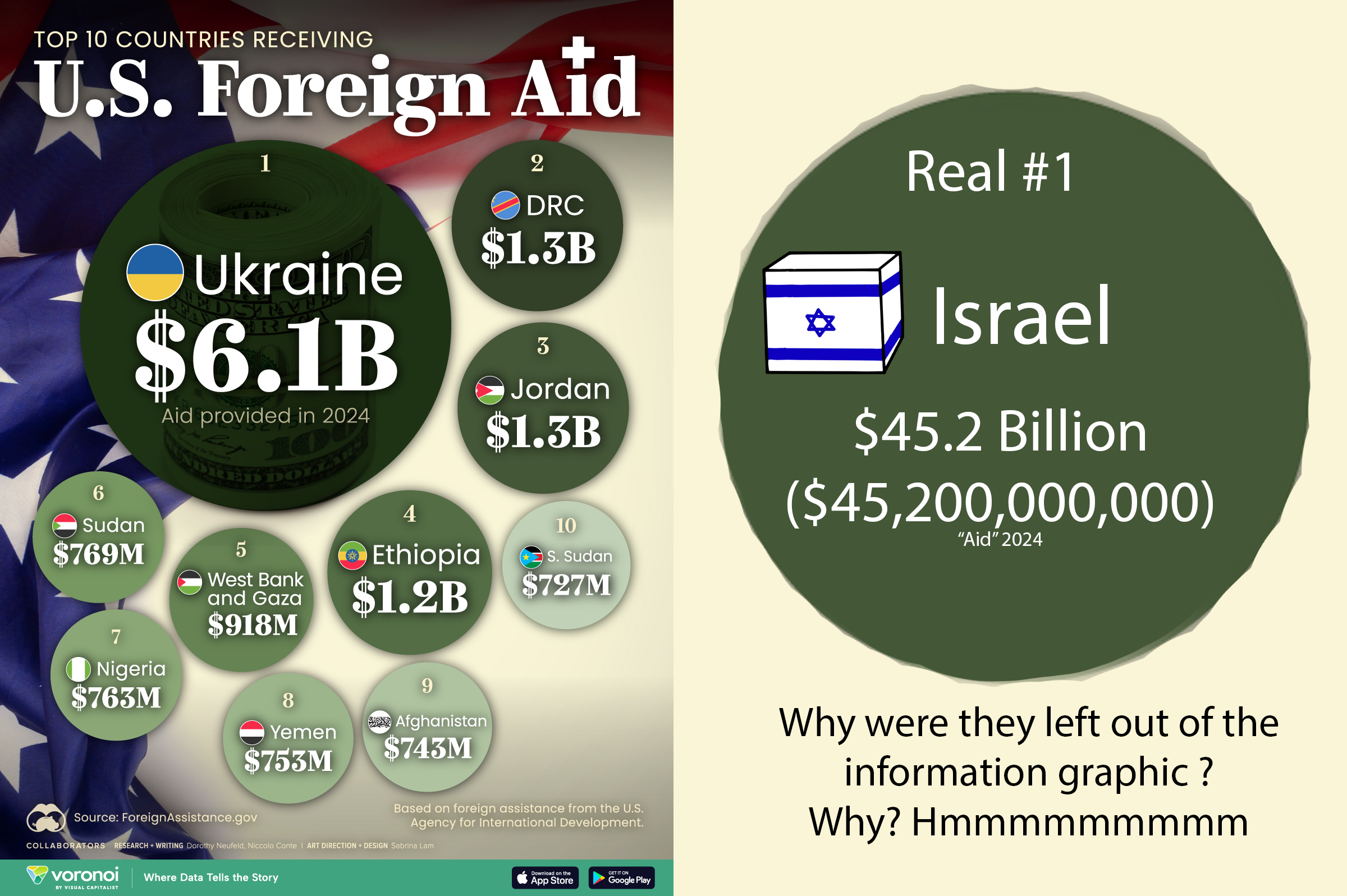 >>532816600We have given Ukraine 250 billion dollars. Egypt alone gets 100 billion dollars. Israel is third with roughly that same amount in your graph. I don't know what kind of fucking aid they're tracking.