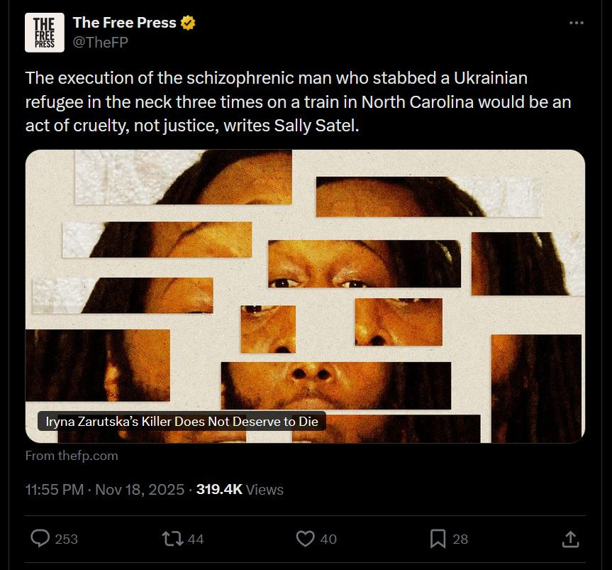 https://www.thefp.com/p/iryna-zarutskas-killer-does-not-deserveHave a fucking heart, chuds. Stop calling for this man's death.
