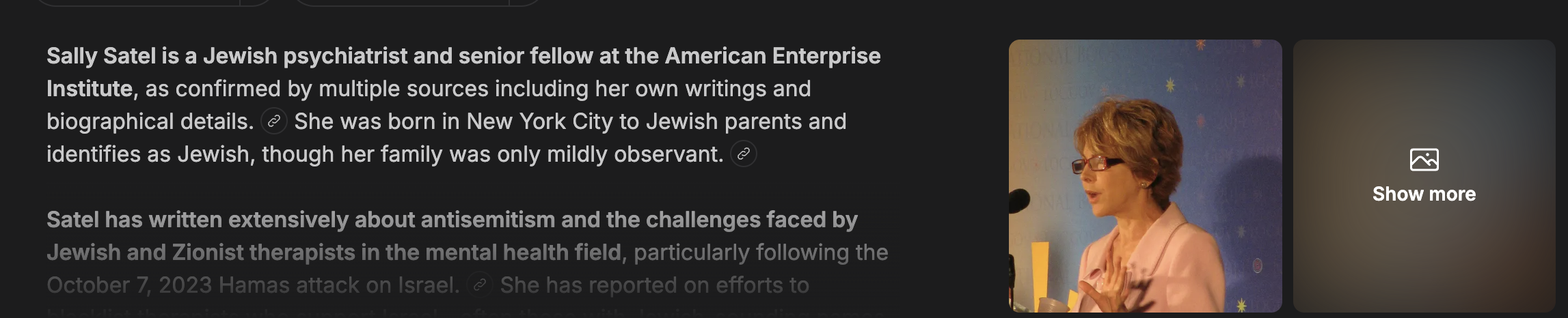 >>532807986>>532808014>Sally SatelSally Satel, M.D., is a Jewish psychiatrist, author, and resident scholar at the American Enterprise Institute (AEI) who grew up in a mildly observant Jewish household in Queens, NY. Known for her criticism of "political correctness" in medicine, she has recently written about antisemitism within professional psychology and efforts to marginalize Jewish therapists.