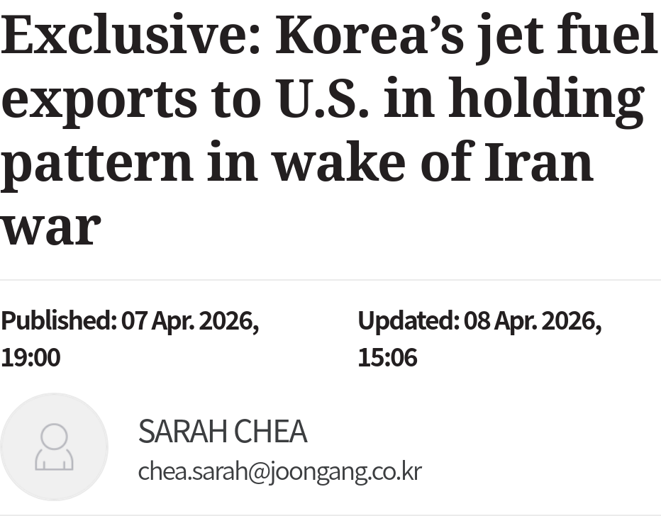> Korea has virtually suspended its jet fuel exports amid crude oil shortages, a move set to hit the United States — which relies on Korean fuel for nearly 70 percent of its imports — the hardest.> Korean oil refiners have sharply scaled back jet fuel production, diverting much of the adjusted volume to domestic demand.>As the world’s top jet fuel exporter, Korea is a critical lifeline for countries like the United States and Australia, leaving them highly exposed to any disruption in Korean shipments. https://koreajoongangdaily.joins.com/news/2026-04-07/business/economy/Exclusive-Koreas-jet-fuel-exports-to-US-grounded-as-Iran-war-rages-unabated/2563132