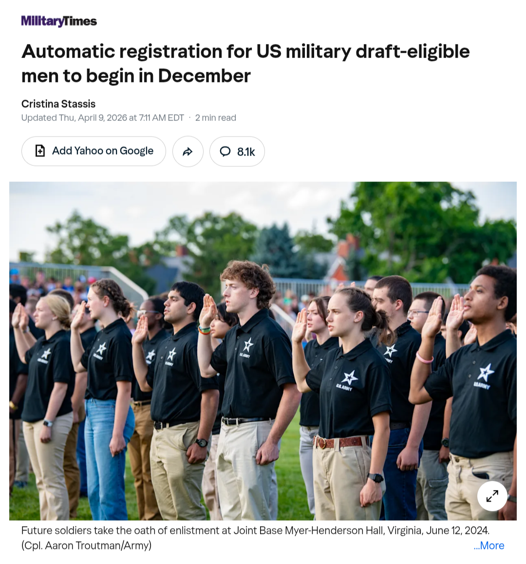 >>532810405They changed the eligibility age to join the military. They have not changed the draft registration age bracket. It still cuts off at 26. If there was a draft happening and they decided to draft slightly older folks first like Ukraine did because of considerations about future population stats, then yes they'd expand the registration window as well, but as things stand currently, if you're 40 and never registered, you still won't be come December.