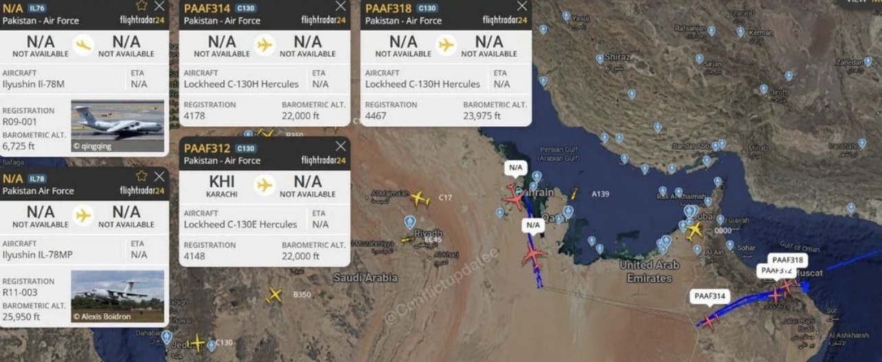2 IL-76 and 3 C-130’s of PAKISTAN AIR FORCE ENROUTE TO THE GULF WHAT ARE THEY TRANSPORTING ISNIT NOOKS? AAAAAAAAA ITS OVER
