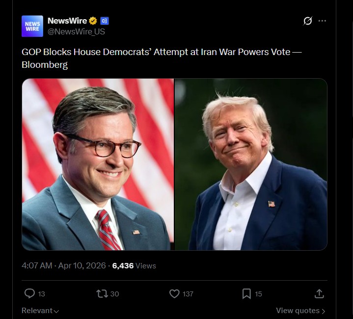 Senator Schumer is happy to allow Trump to dig his own political grave while serving Israel so even if it passed the house any war powers legislation would be DOA in the Senate