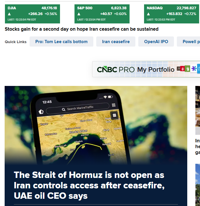 >Stocks gain for a second day on hope Iran ceasefire can be sustained>iran says stait clsoed again due to lebananon strikes>UAE oil baron says strait is still closed???????????????????
