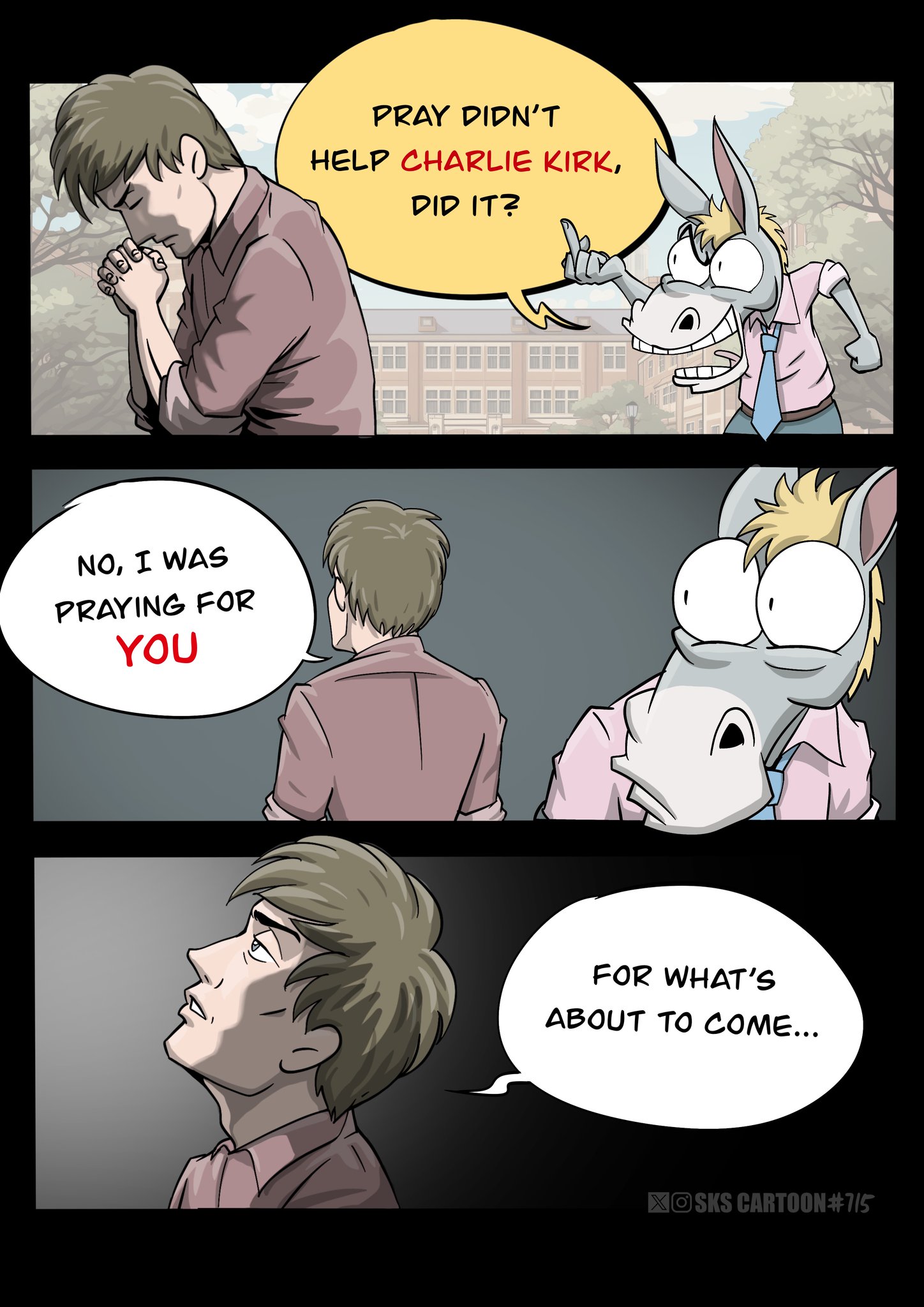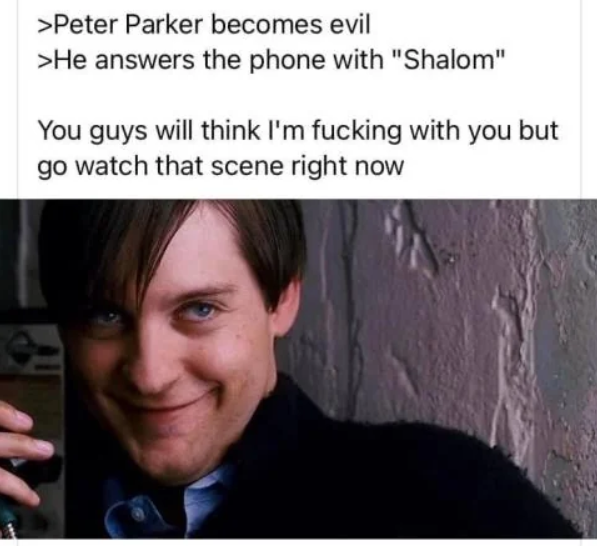 >>532819722Whenever I hear someone is praying for his enemies, I remember that scene from Spiderman when the villain goes to the church to pray and he asks God to fucking kill Peter Parker. KEK.