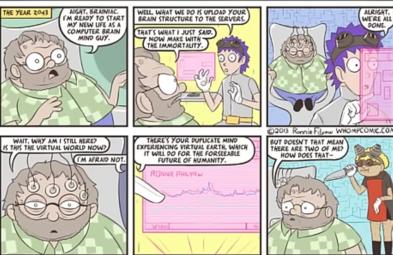 I read somewhere they took brain matter and is making it play DOOM.I dunno if I'm going to trust people to digitize brains. You might end up being forced to farm mats in an MMO until your brain gets banned