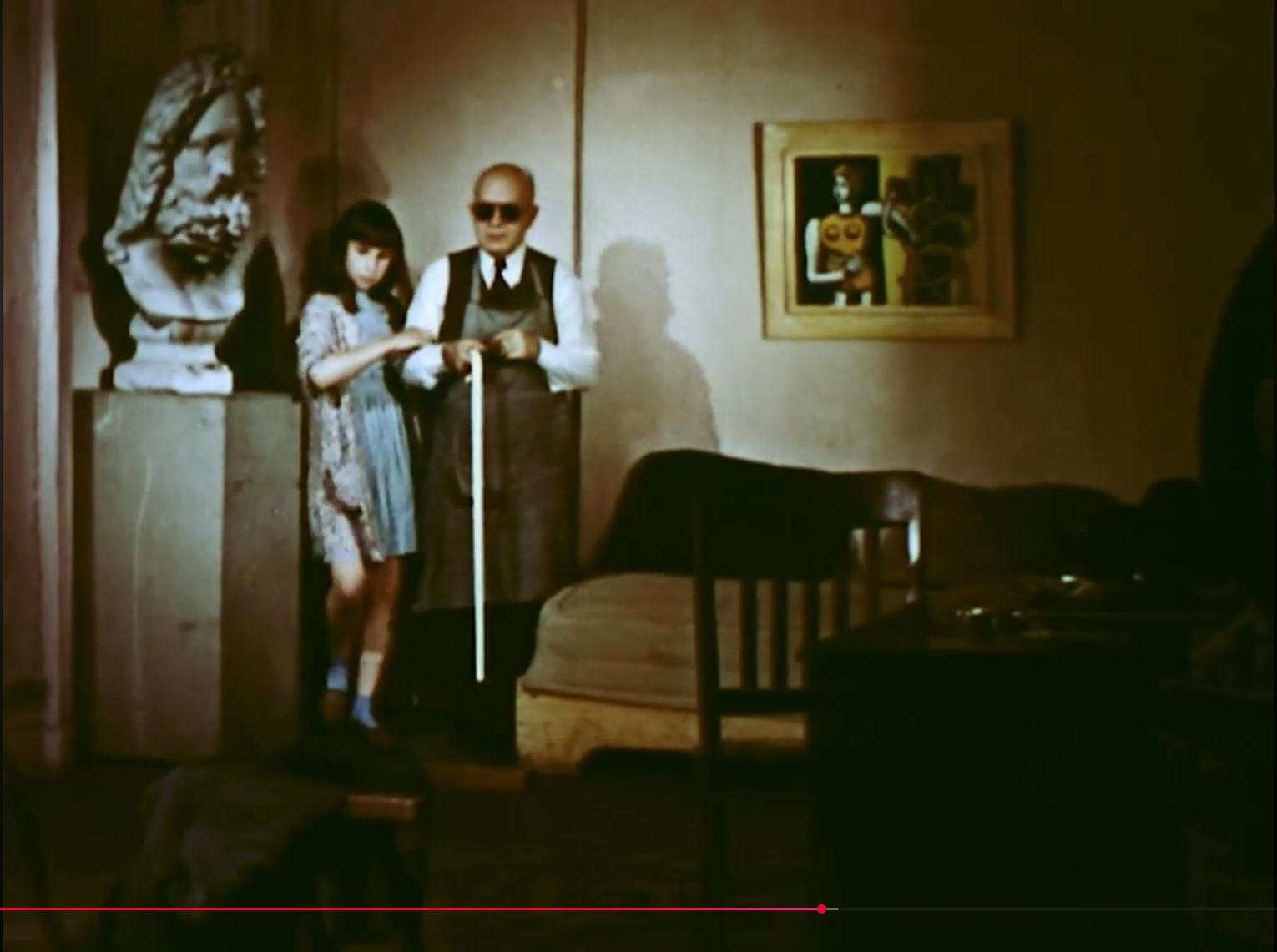 Reminds me of Oppenheimer-Guggenheim, also available on youtube.You don't wanna go into the "forced cuckolding" - as you call it - rabbithole.Old blind man with girl is a jungian allegory.